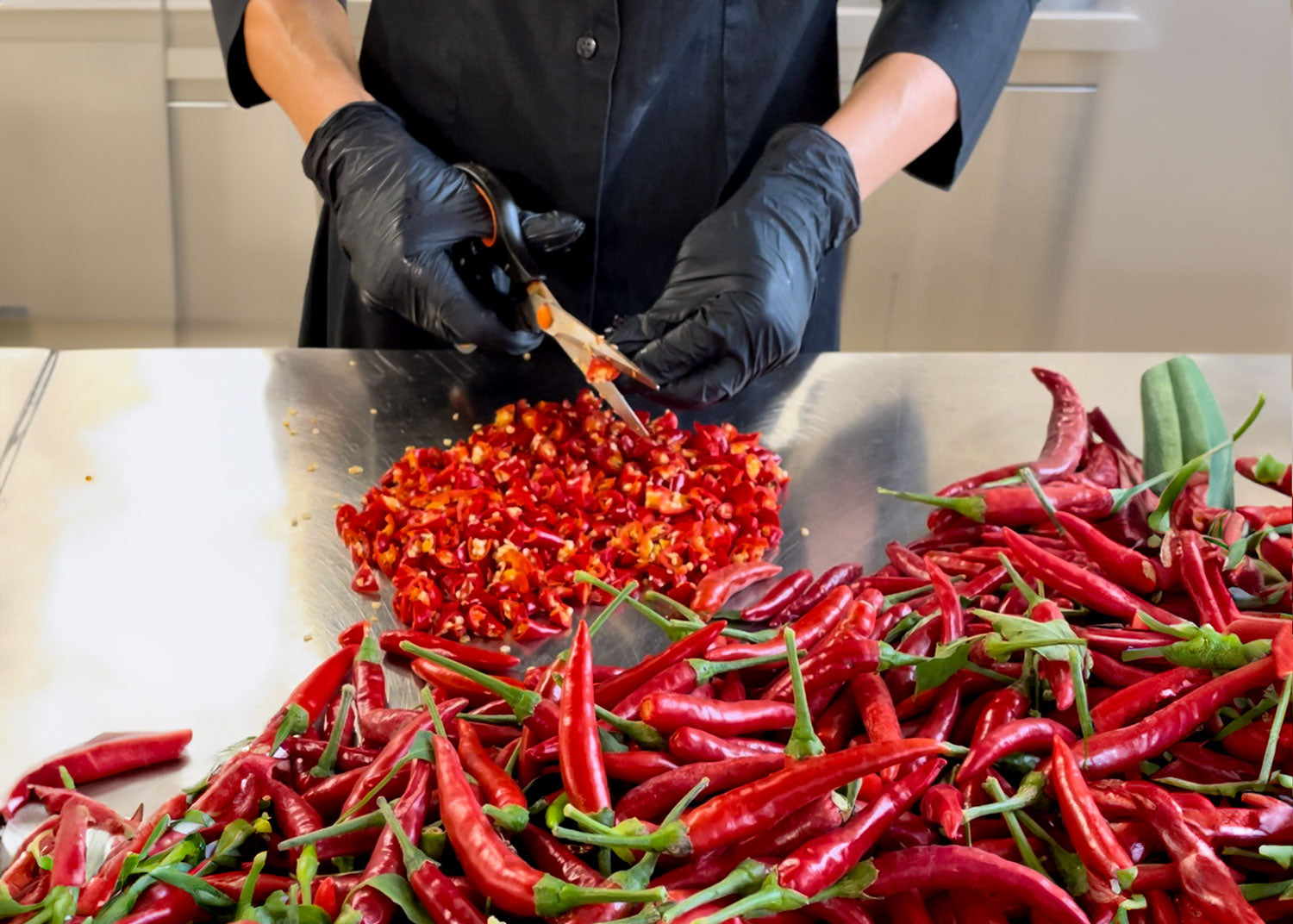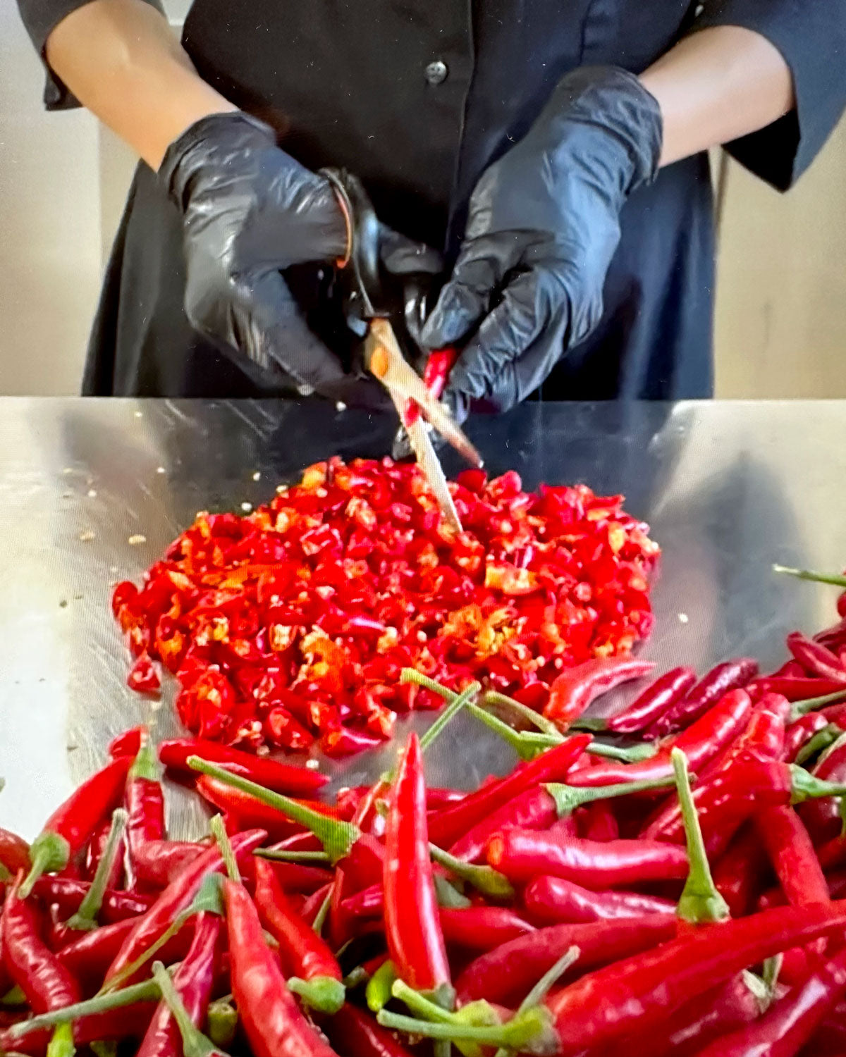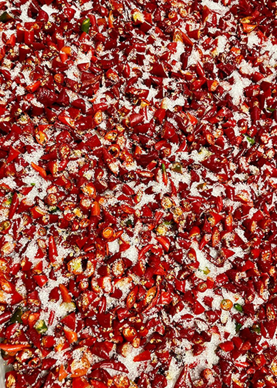 Une fois coupés, les piments sont rassemblés dans un pot spécial percé de petits trous et tournés afin d'en retirer d'autres graines. Les producteurs les recouvrent ensuite de sel et les laissent reposer pendant environ 12 heures. Cette étape retire l'eau naturelle des piments et les nettoie en outre. Ensuite, un bref bain dans du vinaigre permet d'atteindre le pH approprié et de garantir une conservation allant jusqu'à 24 mois, car cette entreprise biologique durable n'utilise pas de conservateurs.