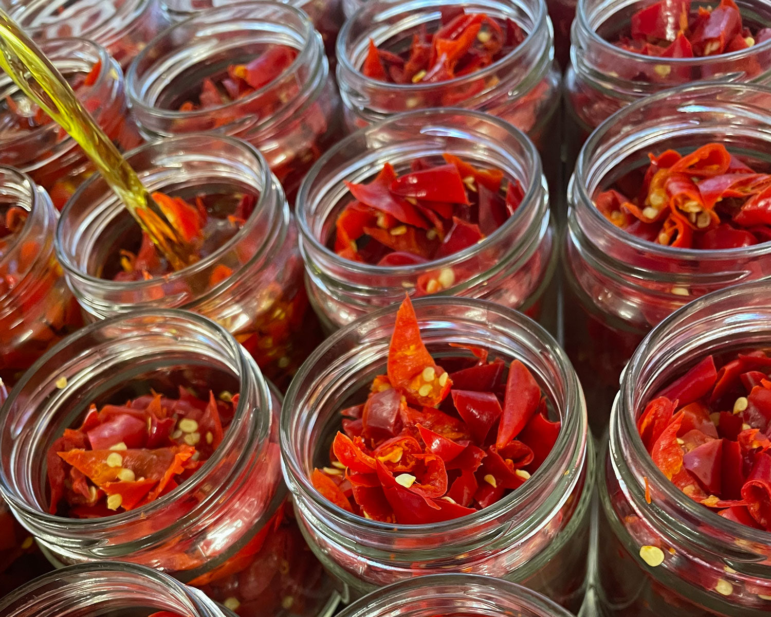 Les piments maintenant préparés sont mis en conserve dans de l'huile d'olive extra-vierge et placés dans des bocaux stériles - cette étape est également entièrement réalisée à la main. L'huile d'olive fruitée combinée au piment calabrais donne une combinaison parfaite de fruité et de piquant ainsi que de douceur et de velouté. Enfin, les bocaux sont pasteurisés afin de garantir la qualité et la sécurité du produit et d'éviter les bactéries et les micro-organismes indésirables.