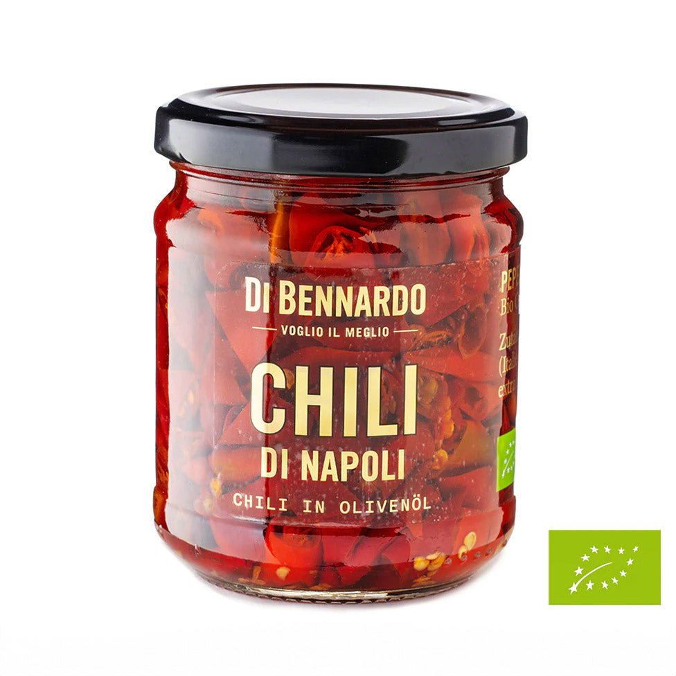 La classe de qualité des piments Di Bennardo conservés dans l'huile d'olive, se traduit par l'utilisation et la composition de ressources purement écologiques. 44 % de piments cultivés biologiquement en Italie, combinés à de l'huile d'olive vierge extra bio de qualité supérieure, du vinaigre de vin et du sel, constituent la base de notre produit haut de gamme. Leur couleur rouge intense ainsi que leur texture ferme sont des indicateurs de leur fraîcheur et de leur qualité.